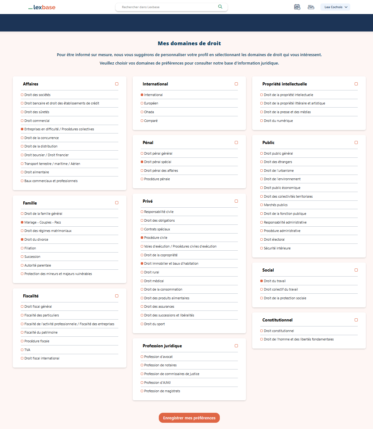 Lexbase c'est rendre accessible le Droit partout et pour tous et c'est pour cette raison que nous vous demandons dès votre première connexion de sélectionner un ou plusieurs domaines afin de vous accompagner au mieux dans vos différentes matières au quotidien.