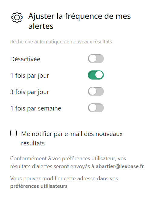 - Modifier la fréquence et choix de réception de cette alerte uniquement (vous pouvez par exemple choisir de recevoir par défaut toutes les alertes au rythme hebdomadaire, et, pour une alerte précise, choisir le rythme quotidien)