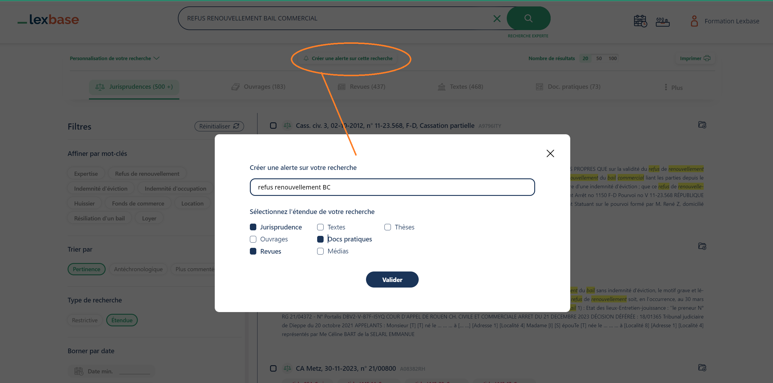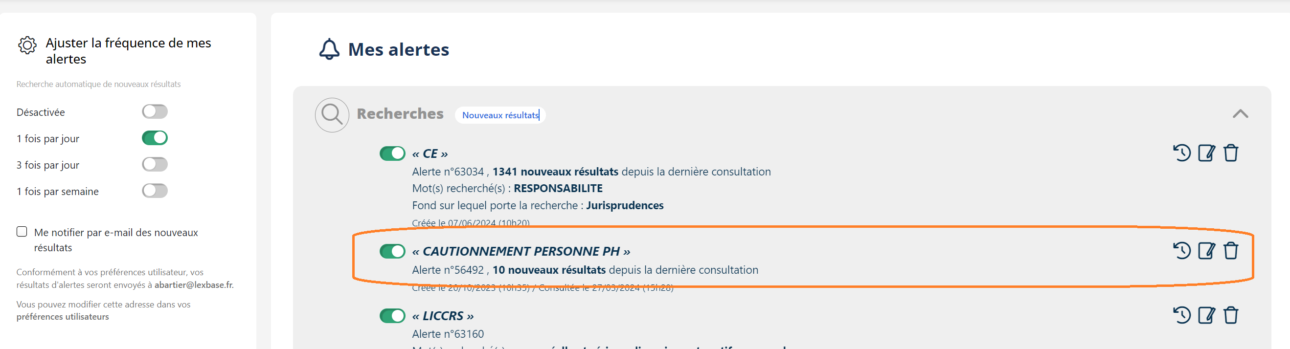 - pour recevoir des résultats d'alertes sur une recherche rapide ou experte (3), cliquer sur Créer une alerte sur cette recherche en haut de votre liste de résultats puis, configurez l'alerte :
